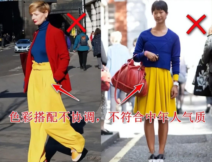 色彩搭配对比度强,尤其是这种亮黄色的衣服,过了五十岁,个人认为是很难去驾驭的,所以劝大家就不要去尝试了。