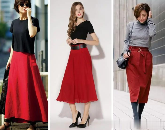 (2)深色上衣 + 红色裙子搭配
